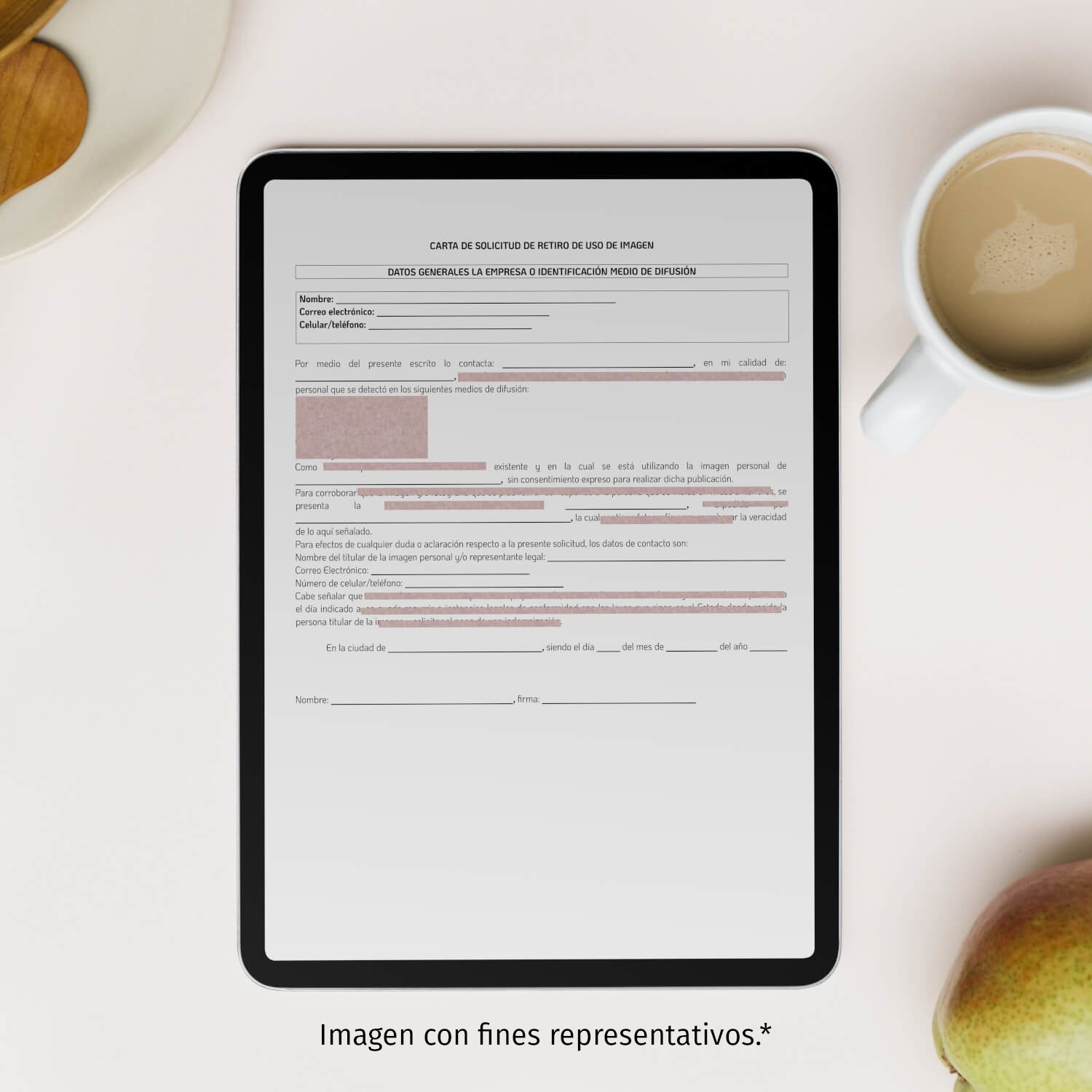 Cada día es más común utilizar la imagen de la persona para publicitar en cualquier medio de comunicación un producto y/o servicio, sin embargo, el desconocimiento ha llevado a usar la imagen personal sin autorización lo cual es incorrecto, ya que es un derecho a la personalidad y nadie goza de un uso libre de la imagen de otra persona sin autorización previa, sea o no una persona conocida. Por eso, es importante que cuando se solicite que se deje de usar la imagen personal en una empresa y/o comercio, se haga de forma correcta, dejando constancia de esa solicitud y éste escrito es el ideal para ayudarte a realizar la solicitud. Este tipo de avisos son sencillos y claros respecto a la pretensión y fáciles de resolver previo a la interposición de una demanda, pero además es una prueba fiel para dar un segundo paso en caso de que la persona haga caso omiso y solicitar una indemnización en la vía judicial.